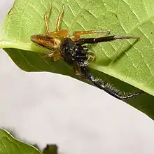 Males and females range in body length from 6 to 13.5 mm.[3] The cephalothorax and first pair of legs are jet black. The elongated abdomen is golden brown, with a central yellow stripe, and sometimes has a greenish sheen.[4] In males, the first pair of legs is elongated, there is a row of dark hairs above the frontal eyes, and the chelicerae (mouthparts) are more robust.