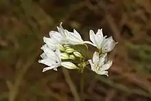 Triteleia hyacinthina is a species of flowering plant known by the common names white brodiaea,[2] white tripletlily, hyacinth brodiaea, and fool's onion. It is native to western North America from British Columbia to Idaho to central California. Its habitat includes grassland and vernally moist areas such as meadows and vernal pools. It is a perennial herb growing from a corm. It produces two or three basal leaves up to 40 centimeters (16 in) long by 2 centimeters (0.79 in) wide. The inflorescence arises on an erect stem up to 60 centimeters (24 in) tall and bears an umbel-like cluster of many flowers. Each flower is a funnel-shaped bloom borne on a pedicel up to 5 centimeters (2.0 in) long. The flower is white, often tinged purple along the tubular throat, with six green-veined tepals. There are six stamens with white, yellow, or occasionally blue anthers.