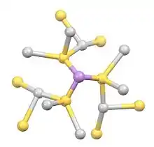 Subunit of the structure of proustite, a sulfosalt mineral. This picture shows the connectivity of the trithioarsenite trianion to Ag+ (arsenic is colored violet).
