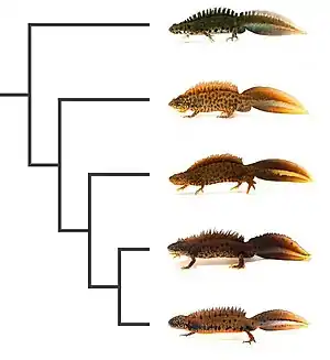 The Danube crested newt was described as a variety of the northern crested newt (Triturus cristatus) by C. Kiritzescu in 1903.[3] Later, it was considered a subspecies until genetic analysis supported its recognition as a separate species in the crested newt species complex.[2] The northern crested newt is its sister species, according to phylogenomic studies.[4][5]