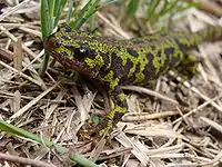 The marbled newt (Triturus marmoratus) is a mainly terrestrial newt native to western Europe. They are found in the Iberian Peninsula and France, where they typically inhabit mountainous areas.