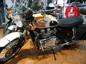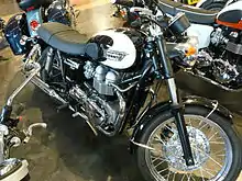 The designation comes from the T100 models produced by Triumph between 1959 and the mid 1970s [4] and it is sold as part of Triumph's "Modern classics" range. The engine features double electrically heated carburettors. Triumph added an air injection unit near the spark plug to achieve emission regulations introduced in 2007.[5]
