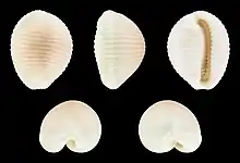Large amount of trivia shell ornaments consisting of Trivia arctica and Trivia monacha have been excavated in Stone Age burials at Téviec in northwestern France, dating back to c. 5000–7000 BC.[2] They are some of the earliest European examples of false cowrie shells used in necklaces and ornaments, for the most part associated with male skeletons. While the trivia genus superficially resembles the true ribbed cowries from the tropics, the two species are not closely related. However, these shells are sometimes called cowries in the British Isles, but are more widely known as false cowries.