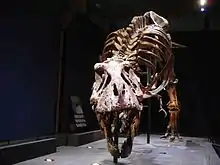 Trix is currently being presented in a unique, low to the ground running pose which allows use of her actual skull instead of a replica, which has required a substantial amount of support that cannot be achieved with a more traditional pose. It is the only Tyrannosaurus specimen alongside MOR 980 (Peck's Rex) in which the mount includes the real skull fossilized bones.[17] Also some of the actual gastralia or belly ribs were used, which had been found in articulation with the remainder of the ribcage, allowing for a particularly realistic restoration of the thorax.[18]