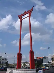 Triyamphway was celebrated to praise the Hindu god Siwa, who was believed to come visit Thailand at the end of every Thai year.[5] He was offered with rice, fruits, and vegetables. Great Swing ceremony was celebrated to make him happy at the well known Sao Chingcha. So many Thai folklores interpret the connection between Siwa and Swing with interesting explanations. After ten days, it was believed that the companion of Siwa, Narai, visits and blesses Thailand for five days.[6]