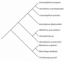 The closest relatives of Trochocarpa gunnii appear to be Monotoca scoparia and Montitega dealbata,[11] both of which occur in Tasmania.[6] M. scoparia is endemic to Australia[12] and is found in many parts of the South East of the country, while M. dealbata is endemic to Tasmania,[13] as T. gunnii is. However, this phylogenetic tree is debated at the genus level and is inconclusive at this specificity.