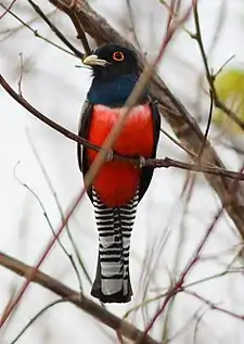 The blue-crowned trogon was formally described by the Swedish naturalist Carl Linnaeus in 1766 in the twelfth edition of his Systema Naturae. He placed it with the other trogons in the genus Trogon and coined the binomial name Trogon curucui.[2][3] Linnaeus based his description on the "Curucui" that had been described and illustrated in 1648 by the German naturalist Georg Marcgrave in his book Historia Naturalis Brasiliae.[4][5] The name "Curucui" and the specific epithet are derived from Surucui, a word from the extinct Brazilian Tupi language for a small bird.[6] A 2008 molecular phylogenetic study of the genus Trogon found that the blue-crowned trogon was sister to the yellow-bellied Guianan trogon (T. violaceus).[7]