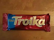 Troika is a chocolate-based confection made by Nidar AS of Trondheim, Norway. It consists of three distinct layers, prompting its name "Troika". The top layer is soft raspberry jelly, the middle layer is truffle, and the bottom one is marzipan. It is also covered with dark chocolate. Troika was launched in 1939 with the name "Geletrøffel". The name of the chocolate is inspired by the Russian word "Troika", which means a group of three.