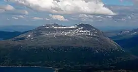 The mountain has three peaks: the eastern peak is 1,522 metres (4,993 ft) tall, the north one is 1,596 metres (5,236 ft) and the south one is 1,616 metres (5,302 ft). You can access all three peaks during the summer, but a sharp and steep ridge between the eastern and northern peak is problematic in the winter for access from the east. The Norwegian Mountain Touring Association has a cabin, Trollheimshytta, near the foot of the northern peak. In the east, there is the cabin Jøldalshytta.[2]