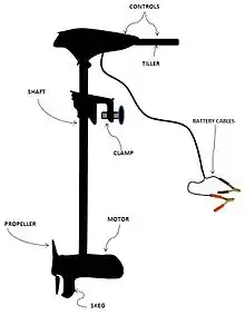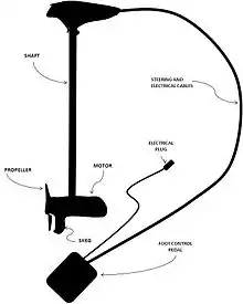 An 1895 article in Scientific American entitled "A Portable Electric Propeller for Boats" stated: "Briefly described, it consists of a movable tube which is hinged at the stern of the boat, much as an oar is used in sculling. The tube contains a flexible shaft formed of three coils of phosphor bronze. This tube extends down and out into the water, where it carries a propeller, and at the inboard end an electric Motor is attached, which is itself driven by batteries." It was invented and sold by the Electric Boat company.[1][2]