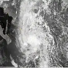 Later on June 18, forecast models indicated that the system might rapidly degenerate prior to landfall. However, the NHC continued to forecast that the depression would attain tropical storm-status before landfall.[7] Shortly after, the depression became increasingly disorganized as convection separated from the center of circulation due to increasing wind shear. Stable air ahead of the system inhibited the possibility of rapid development as warm waters supported intensification.[8] By the morning of June 19, the center of circulation was situated along the southern edge of deep convection, indicating that the depression was beginning to degenerate. Despite this, the NHC continued to anticipate intensification prior to landfall.[9] Embedded within an easterly flow ahead of a mid-level trough, the storm turned towards the north-northeast and accelerated slightly.[10] At 11:00 am PDT (1800 UTC), the depression reached its peak intensity with winds of 35 mph (55 km/h) and a barometric pressure of 1003 mbar (hPa; 29.62 inHg).[1] Operationally, the depression was considered to be slightly stronger, having a minimum pressure of 1001 mbar (hPa; 29.56 inHg).[11] Later that day, the depression began to degenerate into an open trough as it was situated underneath cirrus clouds instead of cumulonimbus clouds.[12] Visible satellite imagery showed that the depression became increasingly ill-defined and the NHC estimated that the depression degenerated into a trough of low pressure near the Islas Marías during the afternoon of June 19.[1] The remnants of the depression were monitored by the United States Naval Research Laboratory for several more hours until the system moved inland over Sinaloa.[13]