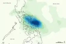 Early on 8 May, Aere made landfall over Northern Catanduanes bringing very heavy rainfall across the nation. Around 210 passengers in the port of Lucena bound for Marinduque and 125 passengers in the port of Romblon bound for San Fernando, Romblon were stranded after their ships were cancelled due to heavy rains and rough sea conditions caused by the storm.[8] More than 100,000 villagers fled from towns threatened by landslides. Aere triggered landslides and floods knocking out power in several areas across Luzon.[9] Thousands were helped to flee from their farms around Mayon volcano in Albay province, which was threatened by landslides and heavy rains that have resulted in extensive flooding after the storm. A resident in Sorsogon province who was one of the victims expressed views on the storm, saying "The floods were so deep, they went past the head".[10] More than 50 flights were canceled or diverted because of the bad weather conditions caused by Aere. President Benigno Aquino III delayed his flight home from a summit in Indonesia by a day due to the bad weather.[11] The Disaster officials advised several villagers in the archipelago's agricultural regions situated in the north to stay prepared for landslides and flash floods after heavy rains poured by the storm.[12] The coastguards have stopped smaller boats from leaving ports in Catanduanes and surrounding areas, leaving 1,379 people stranded after the NDRRMC's announcement that the security at coasts must be tightened.[13] More than 7,200 hectares (17,800 acres - 27 square miles) of rice, corn and high-value crops costing more than 118 million pesos ($2.7 million) were destroyed or damaged.[14] According to the National Disaster Risk Reduction and Management Council, at least 35 people have been killed and two more are missing as a result of Aere. Agricultural losses are estimated at PHP1.37 billion (US$31.7 million).[15] Widespread flooding and landslides damaged homes, blocked off roads and severed communications. In Catarman, Northern Samar, 377.4 mm (14.86 in) of rain fell in just 24 hours, resulted in significant flash flooding.[16]