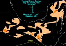 Tropical Storm Andres was the first of many storms of the season, with above-average activity due to one of the strongest El Niño events on record.[1] In most of May 1997, strong westerlies extended across the eastern Pacific Ocean, which inhibited tropical cyclogenesis. Toward the end of the month, however, wind shear decreased in the easternmost portion of the basin, which allowed a low-level circulation to develop; it is possible the system originated from a tropical wave that traversed the Atlantic Ocean in the previous two weeks. Deep convection increased over the circulation on May 31, prompting classifications with the Dvorak technique. Based on satellite imagery, it is estimated the system developed into Tropical Depression One-E early on June 1, about 345 miles (555 km) south of the Gulf of Tehuantepec.[2]