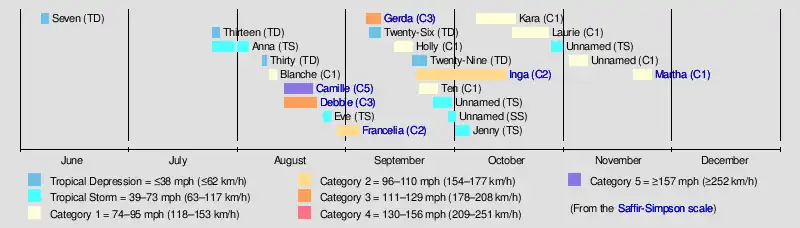 Tropical cyclogenesis began early, with a tropical depression that affected Jamaica. Activity briefly went dormant between June 15 and July 25, when the next depression originated. That same day, the season's first named storm, Anna, developed over the eastern Atlantic. There were five tropical cyclones that formed in the month of August – Blanche, Camille, Debbie, Eve, and Francelia. Camille was the most intense tropical cyclone of the season, peaking as a Category 5 hurricane with maximum sustained winds of 175 mph (282 km/h) and a minimum barometric pressure of 900 mbar (27 inHg).[2]