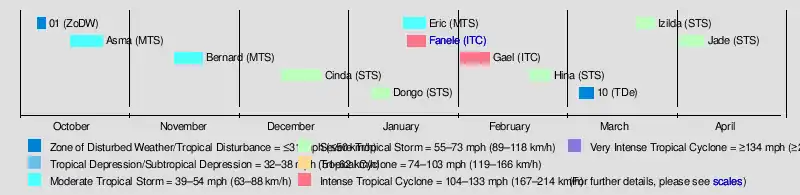 | 12 systems | October 6 – April 10 | 185 km/h (115 mph) | 930 hPa (27.46 inHg) | 30 | ||||