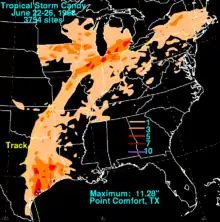 Outside of Texas, 2 to 4 inches (51 to 102 mm) of rain was reported in eastern Oklahoma, northwestern Arkansas, central Missouri, and northern Illinois.[4] Precipitation in Michigan exceeded 6 inches (150 mm) in some areas,[6] contributing to the ongoing flooding event in Ann Arbor.[7] Flash flooding was reported in western New York, due to precipitation amounts up to 3.04 inches (77 mm) in Buffalo during a 24–hour period. As a result, streams overflowed their banks, inundating many basements, sewers, and underpasses.[8] While tropical, Candy spawned 19 tornadoes or funnel-clouds to form between June 23 and 25. Ten were reported in Texas, five in Arkansas, three in Louisiana, and one in Missouri. Five additional tornadoes, which were associated with the extratropical remnants of Candy, were reported on June 25 in eastern Ohio. Despite the amount of tornadoes, only one caused significant damage. That tornado "nearly demolished" a school in Morning Star, Arkansas.[4] The total property damage from the storm was "conservatively" estimated at $1 million, while losses to agriculture in eastern Texas approached $2 million. No deaths were reported in relation to the storm. Candy made 1968 only one of four years to have three named storms in June, with the others being 1886, 1936, and 1959.[4]