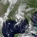 The origins of Tropical Storm Edouard are unclear, but an area of persistent organized storms formed in the Bay of Campeche, which strengthened into a tropical storm on September 14. Edouard rapidly intensified, with wind speeds reaching 65 miles per hour (105 km/h) in 18 hours as a faint eye feature became visible. Following its strengthening, Edouard dissipated even more quickly, degenerating into an area of thunderstorms the next day.[31] The remnants of Edouard moved over land near the port of Veracruz.[32]