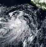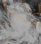 Following peak intensity, Adolph gradually weakened to a Category 1 hurricane.[3] By May 25, Adolph curved sharply north-northeastward, as a result of being steered by anticyclonic deep-layer mean. Despite being situated over fairly warm waters, Adolph weakened considerably due to increased wind shear.[7] Although the EPHC expected the storm to stay at sea,[18] Adolph curved north-northeastward. It was then downgraded to a tropical storm on May 25.[3] Rapidly weakening, Tropical Storm Adolph moved onshore near Puerto Vallarta early the next day. After briefly moving offshore, it again made landfall near Mazatlán at 0800 UTC that day. Adolph soon dissipated over land,[7] becoming the first of two storms to strike the Pacific coast of Mexico during the season.[4] Because Hurricane Adolph weakened significantly prior to landfall,[7] no deaths or major damage occurred.[7] However, the remnants of the storm brought heavy showers and gusty winds to Florida.[19] Although a modern Pacific hurricane season begins May 15,[1] one newspaper considered Adolph a "pre-season" storm.[20]