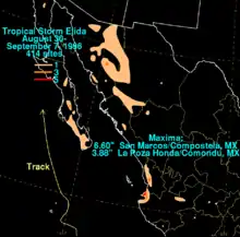 The storm was forecast slightly better than the long term averages for the eastern North Pacific.[1] Elida posed enough of a threat to the Baja California Peninsula to require a tropical storm warning for the Baja California Peninsula south of Cabo San Lázaro on September 3. The warning was lifted on September 5 after the threat ended.[1] Moderate to heavy rains fell in association with the tropical cyclone across southwest Mexico and the Baja California peninsula, with the maxima falling at San Marcos/Compostela in southwest mainland Mexico, which measured 6.60 in (168 mm), and a maximum for Baja California of 3.88 in (99 mm) at La Poza Honda/Comondu.[1] While passing offshore, the tropical storm killed six people and affected 1,200 others,[2] but the damages were minimal.[3]