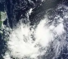 Late on September 13, an area of convectional cloudiness persisted near the same position where Kalmaegi formed. The next day, JTWC upgraded it as a tropical disturbance. The system entered an area of moderate vertical windshear and towards warm waters, as it was upgraded to a tropical depression by the JMA early on September 17. On the same day, the depression moved into the Philippine Area of Responsibility and was locally named Mario.[1] Later the same day, JTWC classified it as Tropical Depression 16W. As vertical windshear decreased around the storm system, it gathered more strength. With this, JMA classified it as a tropical storm, naming it Fung-wong on September 18.[2]