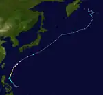 On May 29, a tropical disturbance formed northwest of Palau. On May 30, the disturbance began moving northwestwards, as it slowly strengthened. On May 31, the system's convection became significantly organized near Samar prompting the JTWC to issue a TCFA. Later that day, the PAGASA upgraded the low-pressure area to a tropical depression and assigned its local name Ambo, and the JTWC upgraded the disturbance into a tropical depression. On June 1, the JMA upgraded the system to a tropical storm and named it Mawar. On June 2, the JMA upgraded Mawar to a severe tropical storm, and the JTWC upgraded it to a category 1 typhoon as the convection began to wrap up and organize. On June 3, the JMA upgraded Mawar to a typhoon after the JTWC upgraded it to a category 2 typhoon. Early on June 4, the JTWC upgraded Mawar to a category 3 typhoon but downgraded it to a category 2 typhoon only six hours later, due to increasing wind shear coming from a subtropical jet stream located over Japan. On June 5, Mawar started its extratropical transition, and the JMA downgraded Mawar to a severe tropical storm. On June 6, Mawar fully became extratropical cyclone and dissipated east of the Kamchatka Peninsula on June 13.[23]