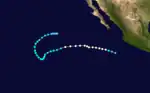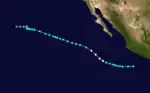 Tropical Depression Eleven formed due south of La Paz, Mexico on September 5. The next morning, the depression became the season's sixth tropical storm and was named Francesca. Francesca entered a period of rapid strengthening for six hours as the storm's winds increased by 35 mph (56 km/h) and became the season's sixth hurricane. After this period of strengthening, Francesca leveled out and remained a hurricane until the morning of September 9 when it weakened prior to a southward dive as the result of interacting with nearby Tropical Storm Gretchen.[7] Francesca continued to trek southward until the evening of September 11, when the storm very sharply recurved. Subsequently, Francesca weakened into a tropical depression as it went due east for 36 hours. Francesca degenerated into a remnant low on the morning of September 16. Francesca was the longest lived hurricane of the season by lasting eleven days. Wave action from Francesca and Hurricane Helga caused beach erosion throughout California.[8]