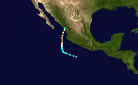 On August 29, the NHC noted that an area of disturbed weather had formed a few hundred miles south of Acapulco, Mexico.[75] The low gradually organized, developing a low-level circulation on August 31.[76] By 18:00 UTC on September 1, it had gained enough organization to be classified as a tropical depression, while situated about 30 mi (45 km) east-southeast of Socorro Island.[77] Then, fueled by increasing deep convection over the depression's western region and near its center, the system strengthened into Tropical Storm Javier early the next day, though its circulation remained somewhat elongated.[78] Despite that, Javier intensified some, attaining sustained winds of 50 mph (85 km/h) on September 3.[79] Later that same day however, the storm crossed over cooler waters and began to weaken.[80] Javier became a post-tropical cyclone on September 4, while moving out to sea.[81]
