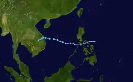According to post-analytic data by the Japan Meteorological Agency (JMA), Linfa developed as a weak tropical depression just to the east of Bicol Region, Philippines on 18:00 UTC of October 6.[2] After crossing the Philippine archipelago of Luzon and entering the waters of the South China Sea, the Joint Typhoon Warning Center (JTWC) issued a tropical cyclone formation alert on October 9.[3] Shortly thereafter, the JMA began operationally tracking the system around 12:00 UTC that day.[4] Twelve hours later, the JMA started initiating advisories on the developing system.[5] After animated satellite imagery depicted a defined low-level circulation center (LLCC) along with flaring deep convection,[6] the JTWC followed suit on classifying the system as a tropical depression and began issuing advisories, giving the identifier of 17W.[7] Being located in warm sea-surface temperatures and low wind shear, the system's overall structure quickly improved.[8] Due to this, the JTWC upgraded 17W to a tropical storm on 15:00 UTC of October 10.[9] Three hours later, the JMA also upgraded the system to a tropical storm, receiving the name Linfa – the fifteenth named storm of the annual typhoon season.[2]