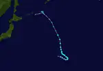 On July 1, the JMA upgraded a low-pressure area it had been monitoring to a tropical depression, located south-southwest of Okinotorishima.[40] Later that day, the JMA began issuing advisories once the depression's sustained winds were estimated at 55 km/h (35 mph).[41] Shortly thereafter, the PAGASA classified the system as a tropical depression, assigning the local name Emong. On July 2, the JMA classified the system as a tropical storm, and assigned the official name Nanmadol.[40] The JTWC followed suit and gave the internal designation of 05W. The cyclone continued to intensify, and was upgraded by the JMA to a severe tropical storm later that day.[40] Nanmadol reached peak intensity at about 06:00 UTC on July 3,[40] and maintained this strength until making landfall on the western coast of Kyushu several hours later. The cyclone began to accelerate while following a generally eastward course across the south of Japan. After brushing the southern coast of Japan, the JTWC issued its final advisory during the next day. The JMA followed suit late on July 4, when it had become extratropical.[40] Its remnants moved out of the basin three days later.[40]