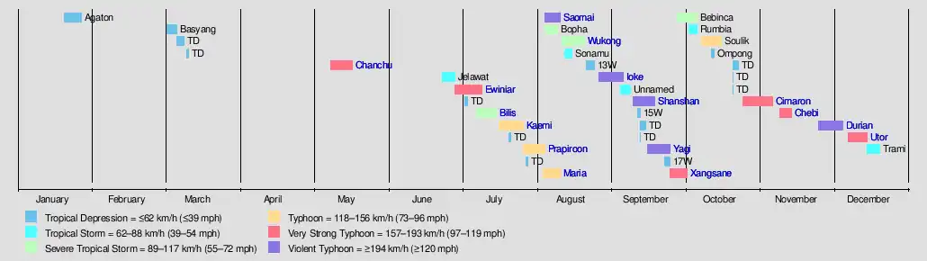 Typhoon Utor (2006)Typhoon DurianTyphoon Chebi (2006)Typhoon Cimaron (2006)Typhoon XangsaneTyphoon Yagi (2006)Typhoon Shanshan (2006)Typhoon IokeTropical Storm Wukong (2006)Typhoon SaomaiTyphoon Maria (2006)Typhoon Prapiroon (2006)Typhoon Kaemi (2006)Tropical Storm BilisTyphoon Ewiniar (2006)Typhoon Chanchu