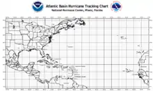 Within the United States since at least 1956,[3] during the Atlantic hurricane season, those within threatened states were provided hurricane tracking charts in order to follow tropical storms and hurricanes during the season for situational awareness. This was more popular along sections of the southern Eastern Seaboard and Gulf Coast of the United States than the coast of California due to their increased danger of a landfalling tropical cyclone. The maps would include place names, latitude and longitude lines,[4] names of the storms on that year's list,[5] along with hurricane preparedness information.[6] Newspapers,[3] television stations,[4] radio stations,[7] banks,[4] restaurants,[8] grocery stores, insurance companies,[5] gas stations, the American Red Cross, the Federal Emergency Management Agency, state departments of emergency management,[9] the National Weather Service,[4] and its subagency the National Hurricane Center were the main suppliers of these charts. Companies would distribute these for free as they were considered good advertising.[4] Some would have a table where you could enter data prior to plotting the storm's position,[10] usually using an associated tropical cyclone symbol: open circle for tropical depression, open circle with curved lines on opposite sides of the circle for tropical storms, and a closed circle with curved lines on opposite sides of the circle for hurricanes.[11] The Vanuatu Meteorology and Geo-Hazards Department started preparing special tropical cyclone tracking charts for its archipelago in the 1980s.[12]
