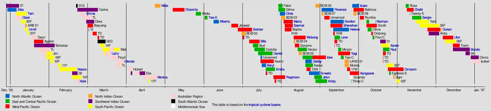 During January 2006, a total of 12 tropical cyclones have developed in tropical cyclone basins. Of those, 7 were named, with 6 of those named systems having tropical storm-equivalent force winds, in ten or three-minute sustained wind speeds. Tropical Storm Zeta from the extremely hyperactive 2005 Atlantic hurricane season became only the second of two tropical storms in the Atlantic to have spanned two different calendar years, with the other being Hurricane Alice of 1954–55. Speaking, Cyclones Tam and Clare were the only tropical cyclones in January 2006 to have known damage totals, even though Boloetse was the most severe and deadliest in the month. Boloetse was also the strongest and most intense tropical cyclone of the month, peaking with 10-minute sustained winds of 100 mph and pressure dropping to 950 hPa/mbar.