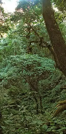 The Western Ghats tropical wet evergreen forests are classified into low-, medium-, and high-elevation types.[2] The Western Ghats monsoon forests occur both on the western (ghats) margins of the coastal and on the eastern side where there is less rainfall. These forests contain several tree species of great commercial significance (e.g. Indian rosewood (Dalbergia latifolia), Malabar Kino (Pterocarpus marsupium), teak (Tectona grandis) and Indian laurel (Terminalia crenulata)), but they have now been cleared from many areas. In the evergreen forests, there is an enormous number of tree species; at least 60 percent of the trees of the upper canopy are of species which individually contribute not more than one percent of the total number. Clumps of bamboo occur along streams or in poorly drained hollows throughout the evergreen and semi-evergreen forests of south-west India, probably in areas once cleared for transportion agriculture.