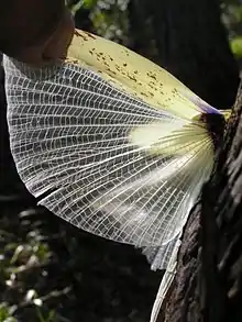 Generally, the female insect is a medium green color and closely resembles leaves, thus making it difficult to spot in the foliage. A large, dark blue spot can be found on each hindwing at the base of the remigium and anal lobe. This dark spot is usually hidden when the wings are folded down.[2] The nymphs also have a long yellow strip that runs down the center of their bodies, which exactly matches the color of the leaf vein. The males can look very different, usually more slender and reddish-brown in color.[3]