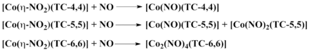 Metal-NO derivatives have been prepared.[14] [Fe(TC-5,5)] also promotes NO disproportionation when in the presence of excess NO; however, in contrast to Mn, the final product is [Fe(NO)(TC-5,5-NO2)], where the iron retains the nitrosyl and the nitrite becomes bound to the ligand.[15]