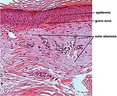 Elastosis is the buildup of elastin in tissues, and is a form of degenerative disease.[10] There are a multitude of causes, but the most commons cause is actinic elastosis of the skin, also known as solar elastosis, which is caused by prolonged and excessive sun exposure, a process known as photoaging. Uncommon causes of skin elastosis include elastosis perforans serpiginosa, perforating calcific elastosis and linear focal elastosis.[10]