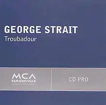 "Troubadour" is a song written by Leslie Satcher and Monty Holmes, and recorded by American country music singer George Strait. It was released in June 2008 as the second single and title track from his album Troubadour. The song was the 86th chart single of his career. It has become his 79th Top Ten single on the Billboard Hot Country Songs chart. "Troubadour" was nominated for Best Male Country Vocal Performance at the 2009 Grammy Awards. Vince Gill sings background vocals on the single.