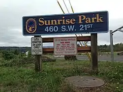 Troutdale's park system includes nearly 20 parks ranging from the heavily used Glenn Otto Park on the banks of the Sandy River to neighborhood parks throughout the city. The city's largest park is Columbia Park which is home to the Imagination Station playground and athletic fields. Sunrise Park consists of a half-mile-long looping trail with views of Mount Hood and rentable community garden beds.[23] Others include College Nature Park, Helen Althaus Park, Kiku Park, Lewellyn Park, Mayors Square, Visionary Park, Weedin Park, and Woodale Park.