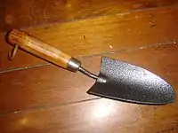 - Garden trowel, (Khurpa in Pakistan/India) a hand tool with a pointed, scoop-shaped metal blade and wooden, metal, or plastic handle. It is comparable to a spade or shovel, but is generally much smaller, being designed for use with one hand. It is used for breaking up earth, digging small holes, especially for planting and weeding, mixing in fertilizer or other additives, and transferring plants to pots.