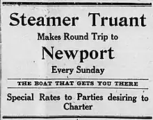 On the Fourth of July, 1910, Truant was scheduled to make extra excursion runs from Toledo to Newport, to leave Toledo at 7 a.m., 12:30 p.m., and 7:30 p.m., and departing Newport for Toledo at 10 a.m., 6 p.m., and immediately after the dance at night.[18] The round trip fare was 75 cents, 25 cents more than the usual Sunday excursion fare to Newport on Truant.[18]