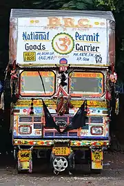 Many trucks and buses are highly customized and decorated by their owners. External truck decoration can cost thousands of dollars.[5] The decoration often contains elements that remind the truck drivers of home, since they may be away from home for months at a time.[6] The art is a mode of expression for the truck drivers.[7] Decoration may include structural changes, paintings, calligraphy and ornamental-decor like mirror work on the front and back of vehicles and wooden carvings on the truck doors. Depictions of various historical scenes and poetic verses are also common.[8] Outfitting is often completed at a coach workshop.[9] Chains and pendants often dangle off the front bumper.[10] In India, motifs depicting eagles, kites, cow nuzzling calf and nazar battu, and catchphrases like "Horn OK Please", "Blow Horn" and "Use Dipper at Night" are frequently seen.[11] Religious iconography, poetry and political logos are also common.[3][12]