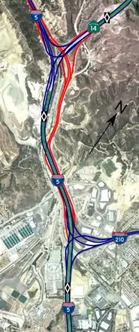 - A truck route from the western terminus of I-210 to the southern terminus of SR 14 at the Newhall Pass Interchange. Trucks traveling on I-5 are separated from passenger cars onto a dedicated roadway to the east– the original U.S. Route 99 over which I-5 was built.