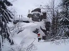 The name Trudenstein is derived from the appearance of the rocks which is supposed to resemble a drude, an old German, witch-like figure associated with dreams.[1][4] In 1783 Johann Wolfgang von Goethe walked past the Trudenstein during one of his visits to the Harz and, in 1811, Caspar David Friedrich drew a sketch of the rocks.[5] They are also said to have inspired the group of rocks in the foreground of his painting, Der Watzmann.[6]