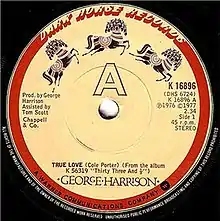 "True Love" is a popular song written by American songwriter Cole Porter, published in 1956. The song was introduced by Bing Crosby and Grace Kelly in the musical film High Society.[2] "True Love" was nominated for the Academy Award for Best Original Song. Kelly's contribution on the record is relatively minor, duetting with Crosby on only the final chorus. Nonetheless, the single is co-credited to her.