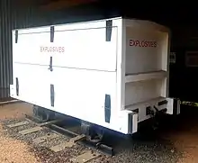 When the explosives had to be shipped to other ports, the explosive boxes were taken by narrow-gauge railway to small boats (lighters) moored at the pier. The specially designed motor-less sailing ships were towed by tugs from the jetty to their moorings at Williamstown.[1] From there lighters took their cargo to larger ships anchored at special explosives buoys in Port Philip Bay.