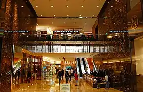 The Trump Organization built a five-story, 15,000-square-foot (1,400 m2) atrium, which serves as the tower's main lobby.[38] The atrium is connected to the Fifth Avenue lobby to the west[39] and 590 Madison Avenue's atrium to the east.[19][40][41] Under the POPS agreement, the atrium is supposed to be open to the public from 8 a.m. to 10 p.m. seven days a week.[42] When the tower opened, the Fifth Avenue Association awarded the first-prize "mixed use building" award to the atrium,[24] the association's first such award in five years.[43] Sometime prior to 2008, the Trump Organization removed the public bench and installed a counter selling Trump-branded merchandise in the public space passageway inside the Fifth Avenue entrance. They were fined $2,500 in 2008 but the counter remained.[44] By 2015, a second counter had been added.[45] In 2016, the Trump Organization was fined $14,000 and ordered to remove the sales counters and reinstall the bench.[45][46]