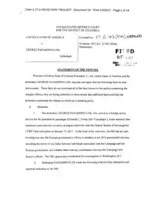 - "Statement of Facts of Guilt". United States v. George Papadopoulos. United States Department of Justice. October 5, 2017. Archived from the original on October 30, 2017. Retrieved October 31, 2017.