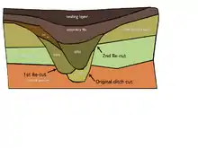 In archaeology and archaeological stratification, a cut or truncation is a context that represents a moment in time when other archaeological deposits were removed for the creation of some feature, such as a ditch or pit. In layman's terms, a cut can be thought of as a hole that was dug in the past, though cut also applies to other parts of the archaeological record such as horizontal truncations like terraced ground. A cut context is sometimes referred to as a "negative context", as opposed to a "positive context". The term denotes that a cut has removed material from the archaeological record or natural at the time of its creation, as opposed to a positive context, which adds material to the archaeological record. A cut has zero thickness and no material properties of its own and is defined by the limits of other contexts. Cuts are seen in the record by virtue of the difference between the material it was cut through and the material that back-fills it. This difference is seen as an "edge" by the archaeologists on site. This is shown in the picture (Fig. 1), where a half sectioned Saxon pit has had half its backfill removed and we can clearly see a difference between the ground the pit was cut into, and the material originally filling the pit. Sometimes these differences are not clear and an archaeologist must rely on experience and insight to discover cuts.