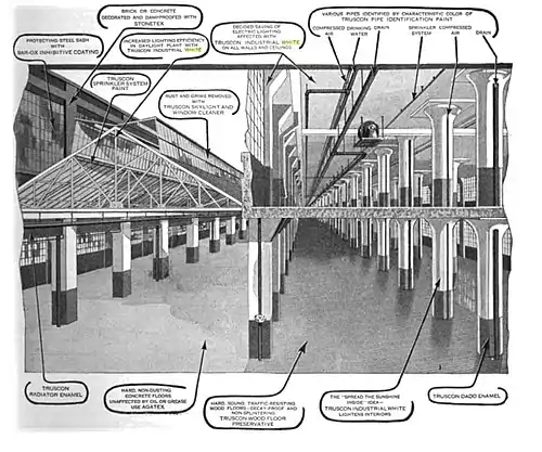 Truscon laboratories waterproofing protection products were for residential housing, apartment buildings, office buildings, hotels, hospitals, and manufacturing plants.[7] They involved enamels and interior finishes.[8] The products were coatings to provide a dustless waterproof washable surface for cement floors and walls.[9] The Truscon laboratories slogan was Waterproof is Weatherproof.[10] Some of the brand names of these specialized products were Asepticote, Sno-Wite, Industrial Enamel, Hospital Enamel, Dairy Enamel, Floor Finish, Edelweiss and Alkali-Proof Wall Size.[11] Its Asepticote waterproofing product was used in houses, hospitals, and hotels for its eye-soothing finish.[12] Truscon's "Waterproofing Paste" was an integral part of cement and used in floors, plaster, and stucco to waterproof walls and floors.[13] "Industrial White" was used in the interiors of mills and factories because of its white brightness qualities.[8] Truscon's "Granatex Floor Varnish", a stain-resistant product, was a transparent waterproofing agent that was used on concrete and wood floors.[8]