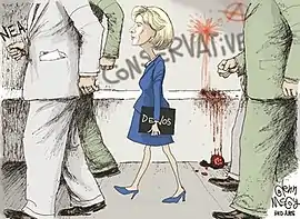 The cartoon depicts a small version of DeVos walking and surrounded by large men in suits, who are possibly guards.[1] The remains of a thrown tomato can also be seen. The word "CONSERVATiVE" is scrawled on the background wall in gray graffiti in addition to a red anarchy symbol. The abbreviation for the National Education Association is also written on the lefthand side.[2]